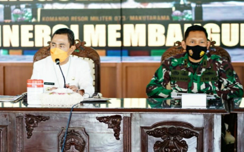 Bupati Pati Haryanto, Sekda Pati Suharyono, Dandim 0718/Pati Letkol Adi Ilham Zamani beserta jajaran, Waka Polres Kompol Sumiarta dan sejumlah instansi terkait, Kamis (3/6), menggelar rapat koordinasi TMMD Reguler ke-111 Tahun Anggaran 2021 di Pendopo Kabupaten Pati.