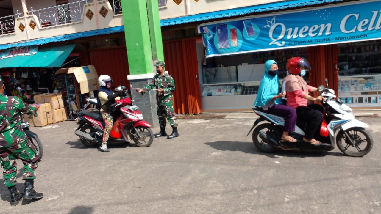 Mempawah – Anggota Kodim 1201/Mempawah membagikan masker gratis bagi masyarakat di pasar Sebukit Rama Mempawah, Jumat (28/5/2021). Itu sebagai langkah antisipatif sekaligus memutus rantai penyebaran Coronavirus Disiase 2019 atau Covid-19.