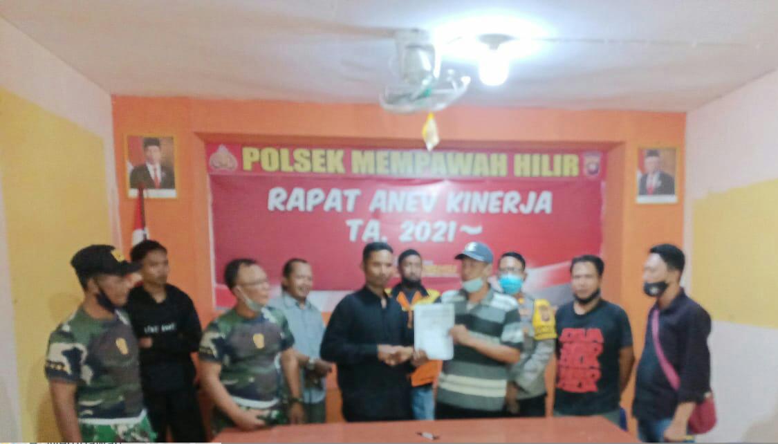 Mempawah – Danramil 1201-03/Mempawah Hilir, Peltu Apriadi dan Kapolsek memediasi warga Desa Pasir yang berseteru karena salah paham di Mapolsek Mempawah Hilir, Minggu (30/5/2021)