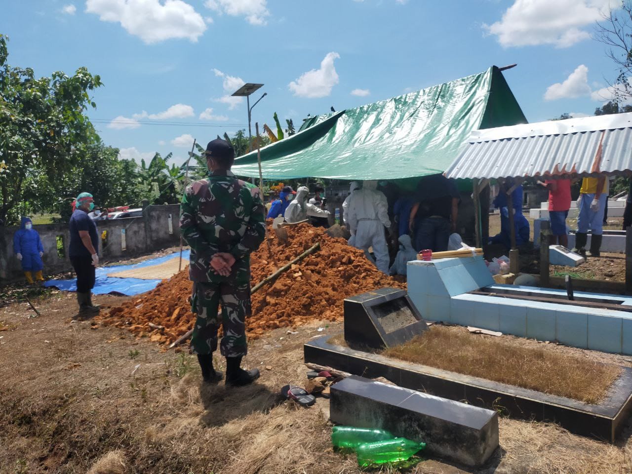 “Usai melaksanakan pendampingan pemakaman Danramil memerintahkan anggotanya untuk mandi dan mengganti pakaiannya yang habis dipakai dan semua barang yang dipake diseterilkan dengan desinfectan,” tegas Kapten Czi Kiki Gunawan.