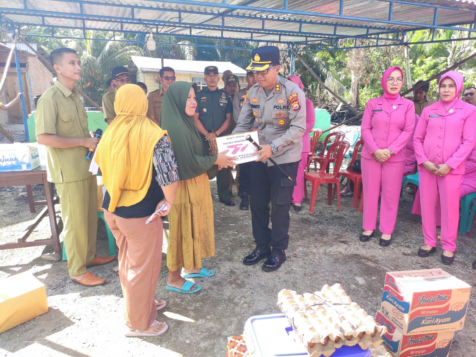Senada dengan Kapolres Mukomuko, Ketua Bhayangkari Cabang Mukomuko Ny. Steva Nuswanto mengatakan bahwa di momentum HUT Bhayangkara ke 77 ini, Bhayangkari Polres Mukomuko juga berusaha turut andil ikut membantu saudara kita yang tertimpa musibah.
