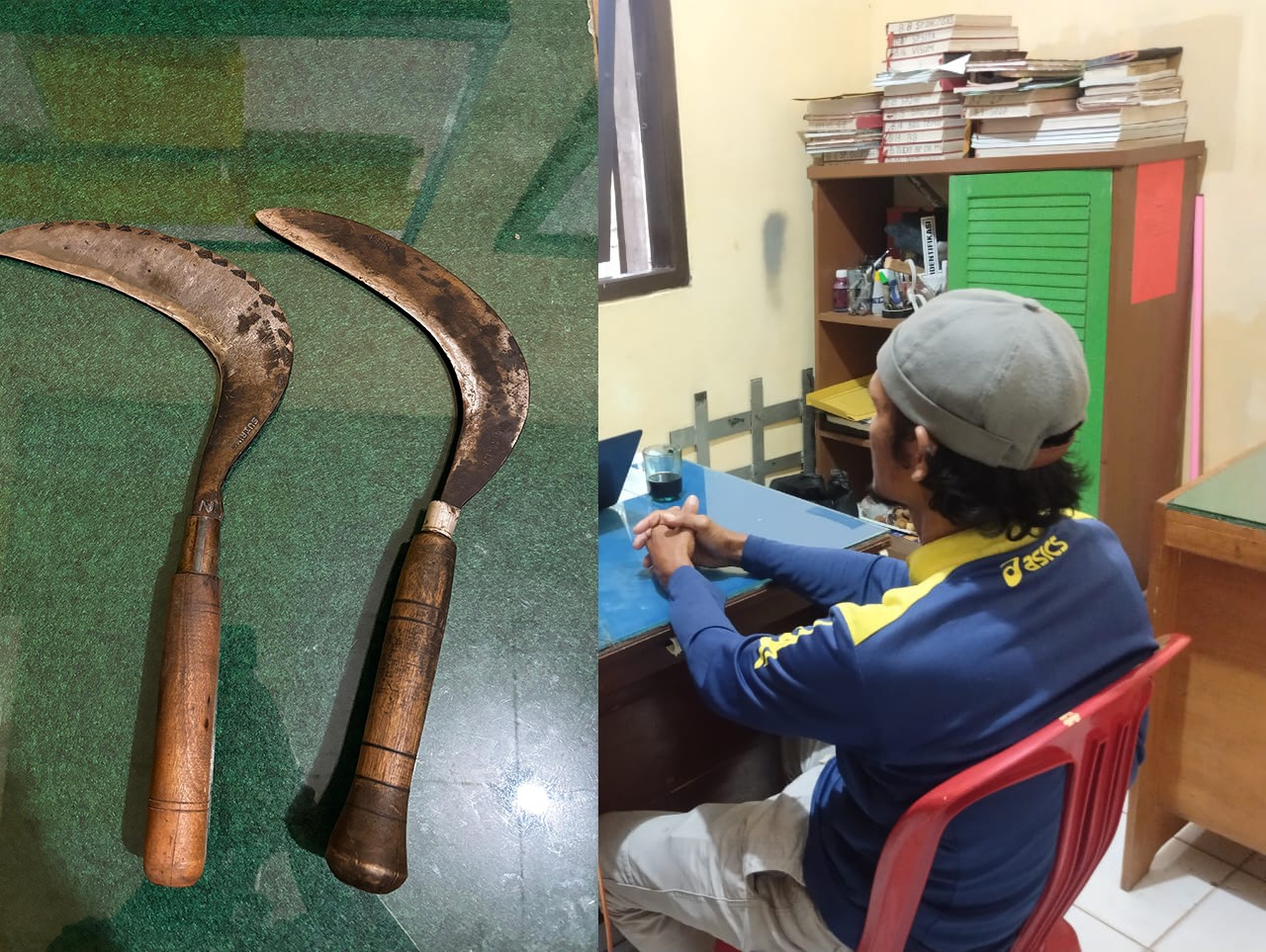 “Berdasarkan laporan korban, terduga pelaku kita tangkap bersama barang bukti 2 bilah sabit, 1 unit sepeda motor, dan barang bukti lainnya,” terang Wakapolres.