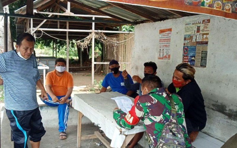 Babinsa Kelurahan Tanjung Merah, Sertu Reskiman bersama Amis Wowor Selir dan Kepala Lingkungan serta Ketua RT setempat melaksanakan giat Komsos membahas tentang bahaya Covid-19. Senin (4/1/2021).