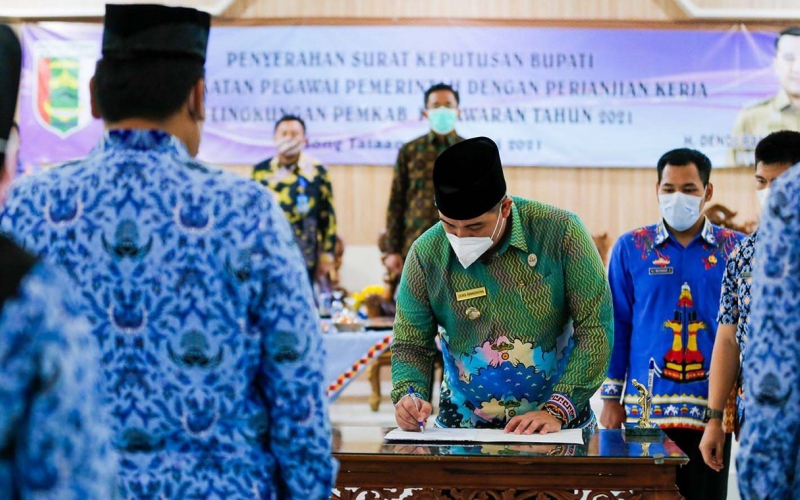 Bupati Pesawaran Hi. Dendi Ramadhona K. S.T., M.Tr.I.p, menghadiri dan memberikan sambutan pada Acara Penyerahan SK Pengangkatan Pegawai Pemerintah dengan Perjanjian Kerja (PPPK) dan Penyerahan SK CPNS Menjadi PNS, serta Pengambilan Sumpah Pejabat Fungsional Di Lingkungan Pemerintah Daerah Kabupaten Pesawaran Tahun 2021, di GSG Pemkab Pesawaran, Kamis (4/2/2021) Siang.