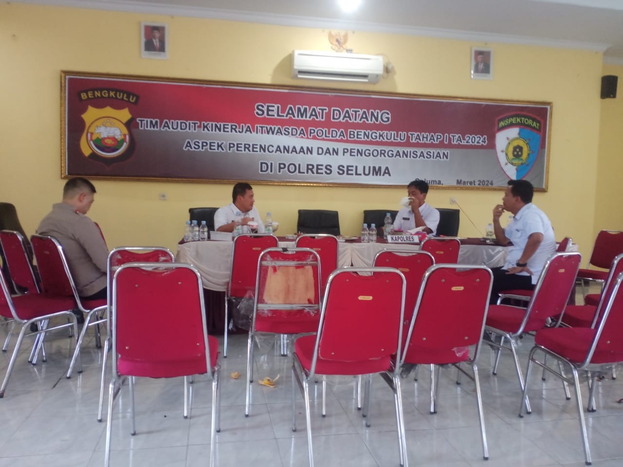 Tim Audit Kinerja Itwasda Polda Bengkulu Tahap I TA 2024 di Polres Seluma diterima oleh Kapolres Seluma AKBP Arif Eko Prastyo, S.I.K.M.H beserta PJU Polres .