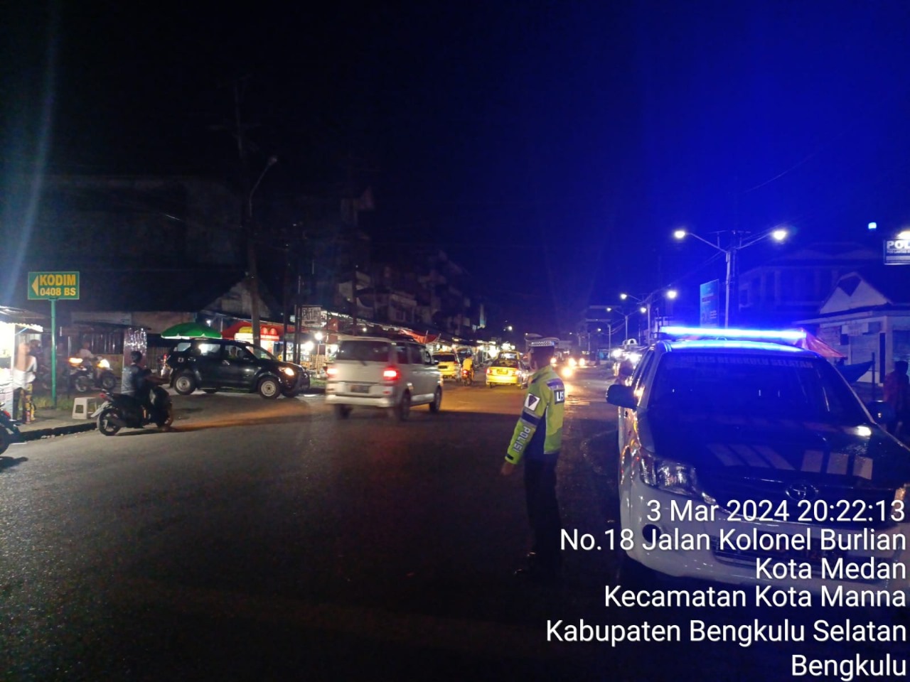 Bengkulu Selatan – Patroli dilaksanakan pukul 20.30 Wib s/d oleh Kanit Turjawali IPDA Sudarminta dan personel Sat Lantas Briptu Febrian serta Briptu Eduar selaku Banit Turjawali, melaksanakan Patroli Bluelight di wilayah hukum Seputaran Kota Manna Bengkulu Selatan, pada Senin (04/02/24) malam.