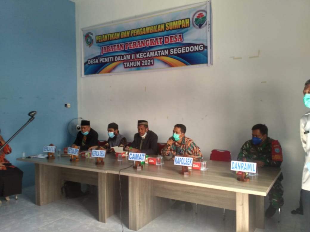 Mempawah – Danramil 01/Jongkat Kapten Buntoro Nugroho yang diwakili oleh Batih Tuud Serma Indra Gunawan menghadiri pelantikan dan pengambilan sumpah jabatan sebagai perangkat Desa Peniti Dalam Dua, Kecamatan Segedong, Kabupaten Mempawah, Kamis (3/6/2021).