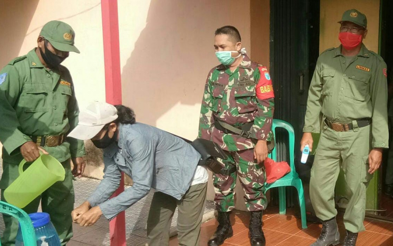 Babinsa Koramil 1201-09/Sengah Temilla mengedukasi para Linmas Desa Keranji Mancal untuk mengajarkan warga cuci tangan dan memakai masker sebagai pelopor penerapan protokol kesehatan di Desa, Selasa (1/6/2021).