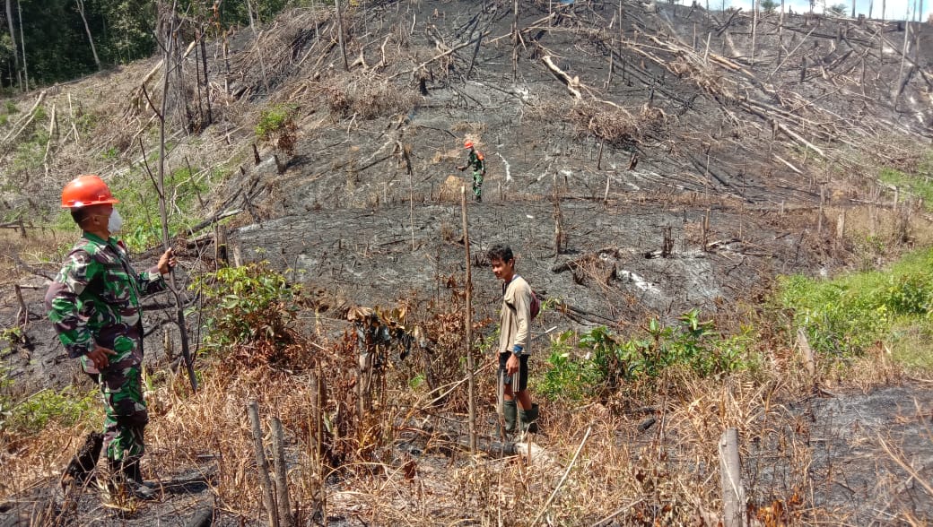 Landak – Babinsa Koramil 1201-10/Menyuke dikerahkan untuk mengecek titik panas di Desa Meranti, Kecamatan Meranti, Kabupaten Landak, Kamis (3/6/2021). Pada koordinat titik panas, ditemukan lahan terbakar seluas 0,8 hektare.