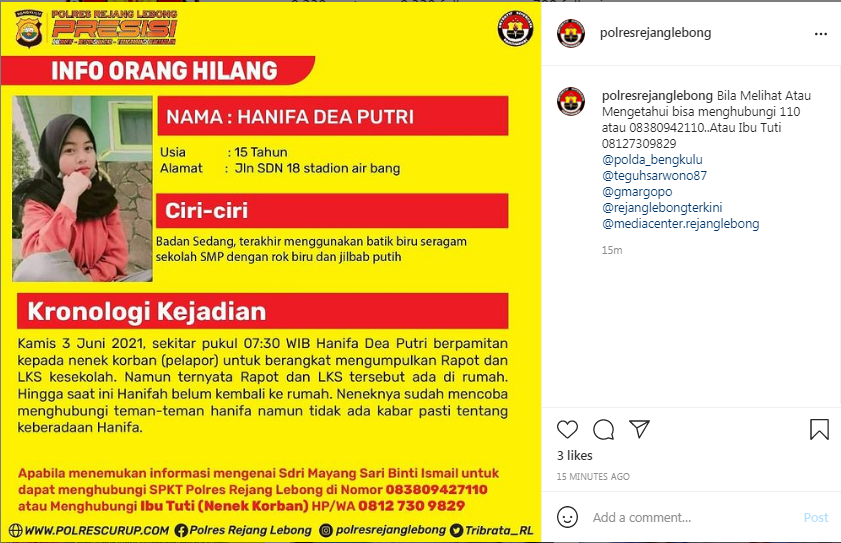Hanifa Dea Putri (15) pelajar yang beralamat di Jalan SDN 18 Stadion Air Bang dilaporkan sejak kamis lalu 3 Juni 2021 hilang. Berdasarkan laporan dari keluarga korban, Hanifa sebelumnya berpamitan kepada nenek korban untuk berangkat mengumpulkan rapot dan LKS ke sekolah. Namun setelah dicek nenek korban, Rapot dan LKS tersebut ada di rumah. Hingga saat ini Hanifah belum kembali ke rumah.