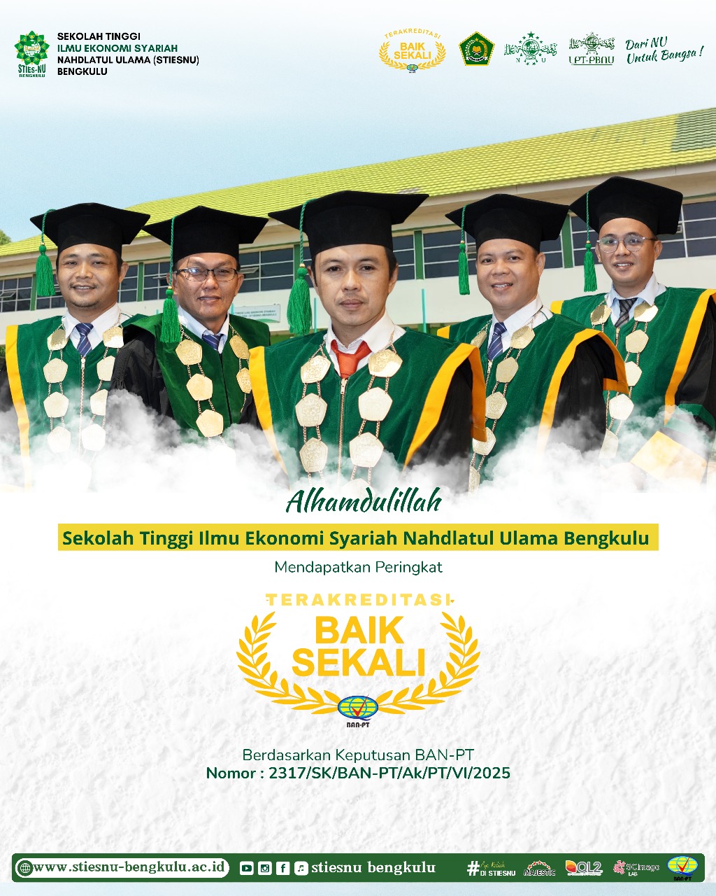 Bengkulu – Kabar menggembirakan datang dari Sekolah Tinggi Ilmu Ekonomi Syariah Nahdlatul Ulama (STIESNU) Bengkulu. Hari ini, secara resmi telah terbit Surat Keputusan (SK) dari Badan Akreditasi Nasional Perguruan Tinggi (BAN-PT) yang menetapkan bahwa STIESNU Bengkulu memperoleh peringkat Akreditasi “Baik Sekali”.