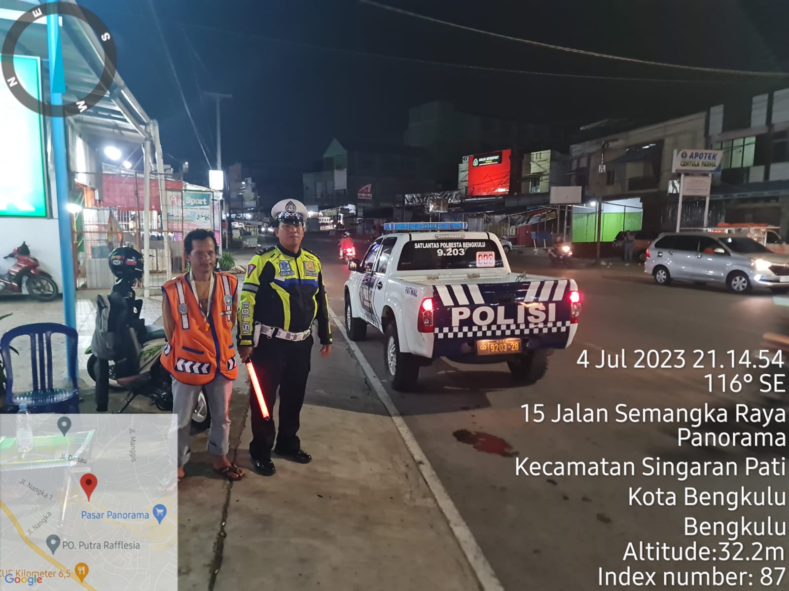 Kota Bengkulu – Personel Sat Lantas Polresta Bengkulu melakukan Blue Light patroli dan antisipasi 3C sekaligus aksi balap liar di wilayah hukum Polresta Bengkulu, Selasa (04/07/2023) malam.