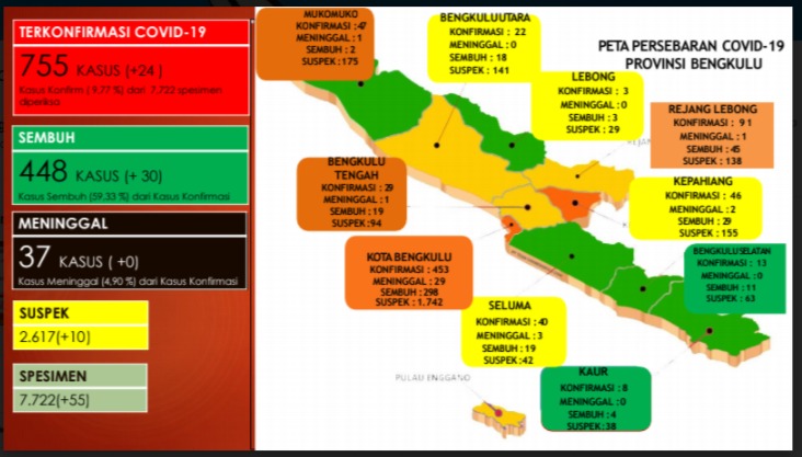 Adapun jumlah kasus positif Covid-19 sampai hari ini berjumlah 755 kasus, dari jumlah itu 448 dinyatakan sembuh dan 37 meninggal dunia.