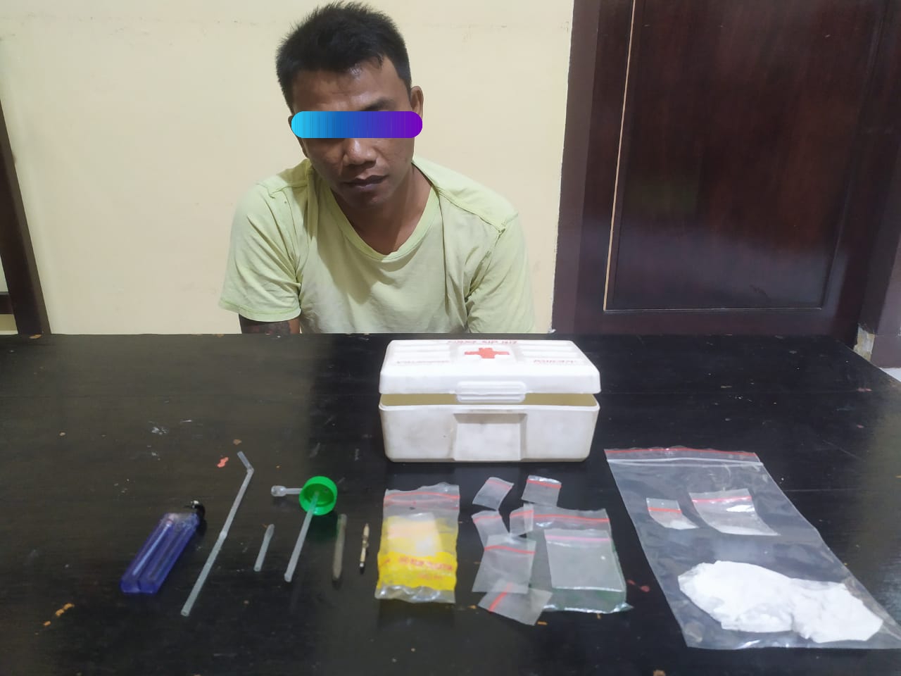 “Selain itu petugas menemukan 1 buah kotak P3K warna putih didalam lemari dapur yang didalamnya terdapat peralatan untuk menggunakan sabu yakni 1 buah kaca pirek, 13  buah plastik bening klip merah, 1 buah pipet berbentuk skop,1  buah korek api warna biru, 1 buah tutup botol yang sudah berlubang dan 2 buah pipet yang sudah dibengkokan,” terangnya.