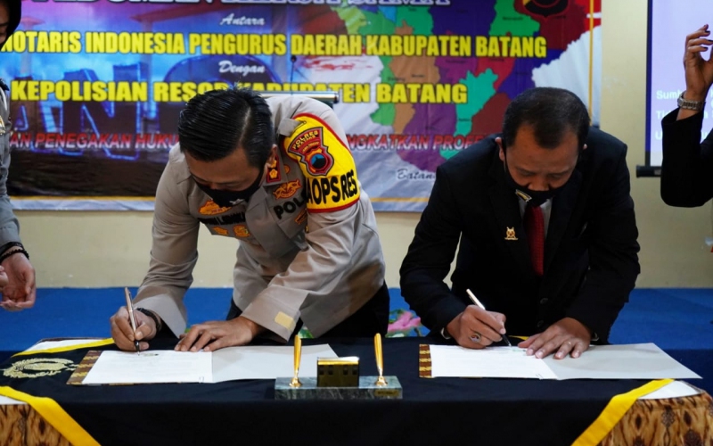 Pengurus Daerah (Pengda) Ikatan Notaris Indonesia (INI) Batang melakukan penandatanganan kerja sama dengan Kepolisian Resor Batang (Polres) Batang.