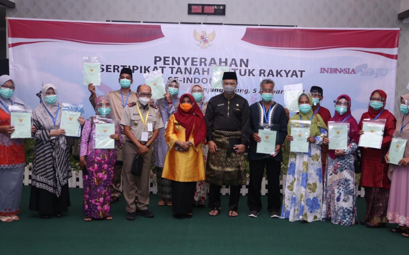 Presiden Joko Widodo (Jokowi) menyerahkan secara simbolis sertifikat hak atas tanah kepada masyarakat melalui program Sertifikat Tanah untuk Rakyat Se-Indonesia di Istana Negara, Jakarta secara virtual, Selasa (5/1). Untuk Kota Tanjung Pinang dilaksanakan di Aula Sultan Sulaiman Badrul Alamsyah dan diikuti oleh 30 penerima simbolis, Walikota Tanjung Pinang, Sekda Kota Tanjung Pinang dan Kepala Kantor Pertanahan Kota Tanjung Pinang.