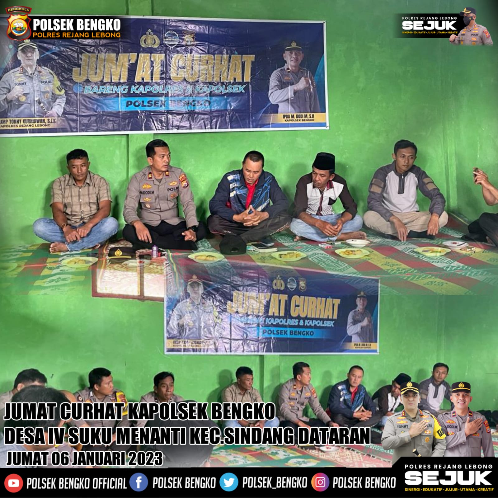 Siberindo.co – Kapolres Rejang Lebong Polda Bengkulu bersama Kapolsek Bengko dan jajaran kembali menggelar Jumat Curhat. Jumat Curhat Kapolres kali ini digelar di Desa IV Suku Menanti Kecamatan Sindang Datarab Kabupaten Rejang Lebong, Jumat (6/1/2023).