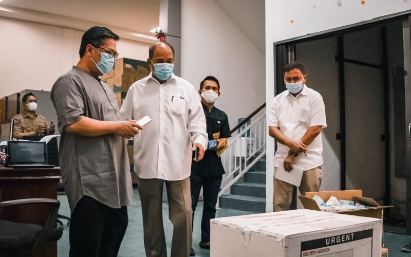 Rombongan pemko Tebing Tinggi yang dipimpin Walikota Ir. H. Umar Zunaidi Hasibuan, MM bersama dengan Sekretaris Daerah Kota Tebingtinggi, Muhammad Dimiyathi, S.Sos, M.Tp, dan jajaran OPD, Kepala Dinas Kominfo Kota Tebingtinggi, Dedi Parulian Siagian, S.STP, M.Si dan Sekretaris Dinas Kesehatan Kota Tebingtinggi Drs. Azhar bersama personel Polres Kota Tebingtinggi menjemput pendistribusian vaksin Covid-19 di Gudang Vaksin Dinas Kesehatan Provinsi Sumatera Utara, Kota Medan, Hari Jumat (05/02/2021).