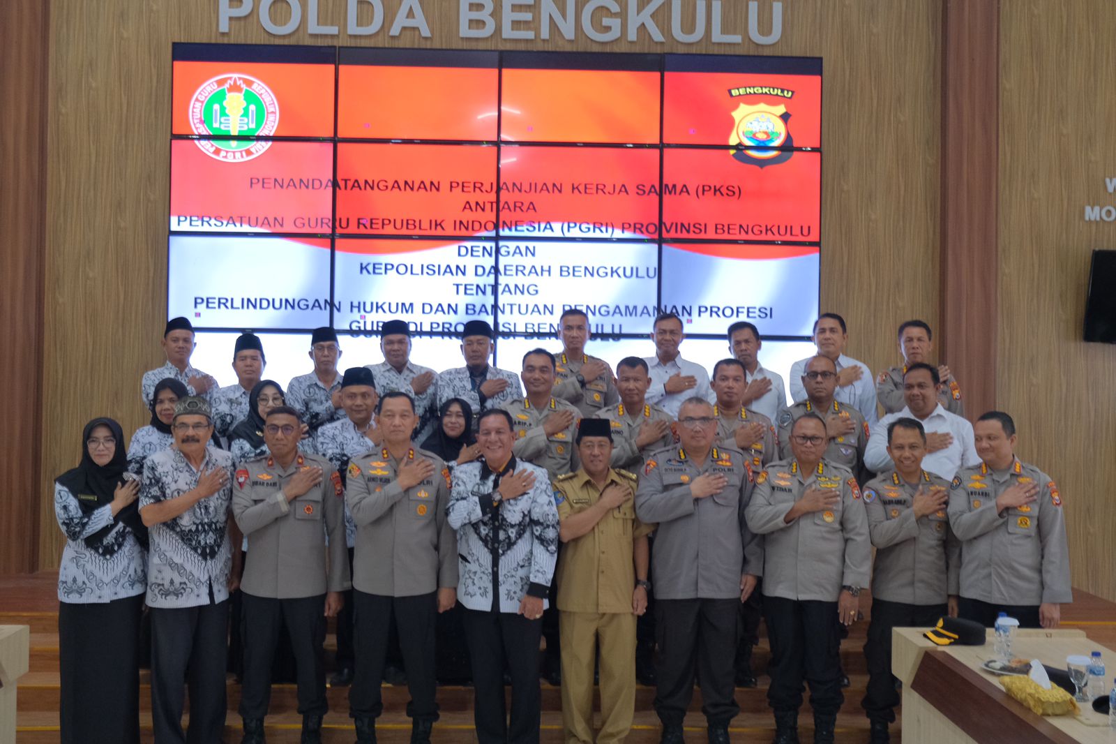 Bengkulu, Siberindo.co – Upaya meningkatkan jalinan sinergi antar instansi bersama polri, Polda Bengkulu pagi hari ini Senin (06/03/2023) menggelar kegiatan Penandatanganan Naskah Perjanjian Kerja Sama (PKS) dengan Persatuan Guru Republik Indonesia (PGRI) Provinsi Bengkulu tentang Perlindungan Hukum dan Bantuan Pengamanan Profesi Guru.