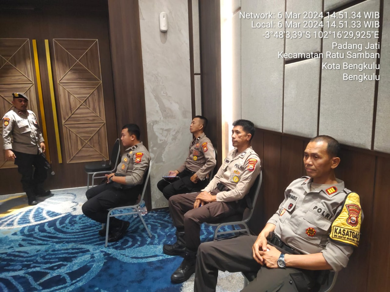 Bengkulu – Personel OMB Polresta Bengkulu Polda Bengkulu melaksankan pengamanan Rapat Pleno terbuka Rekapitulas Hasil Penghitungan Perolehan Suara Ditingkat Provinsi dalam Pemilihan Umum Tahun 2024, di Hotel Mercure Rabu (06/03/2024).