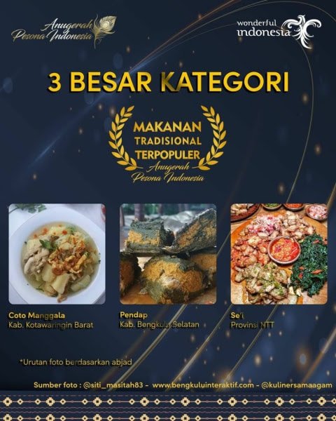 Pada tahun 2020 lalu, Anugerah Pesona Indonesia telah menginjak penyelenggaraan yang ke-5. API 2020 kali ini diikuti oleh 34 Provinsi dan 140 Kabupaten/Kota yang terwakili dalam 180 nominasi pada 18 kategori yang ada. Dan untuk Kategori Makanan Tradisional Terpopuler pada vote yang dimulai November 2020 lalu adalah Coto Manggala, dari Kotawaringin Barat dengan perolehan 16,3%, Pendap, dari Bengkulu Selatan dengan perolehan 14,3% dan Se’i, dari NTT dengan perolehan 12,1%.