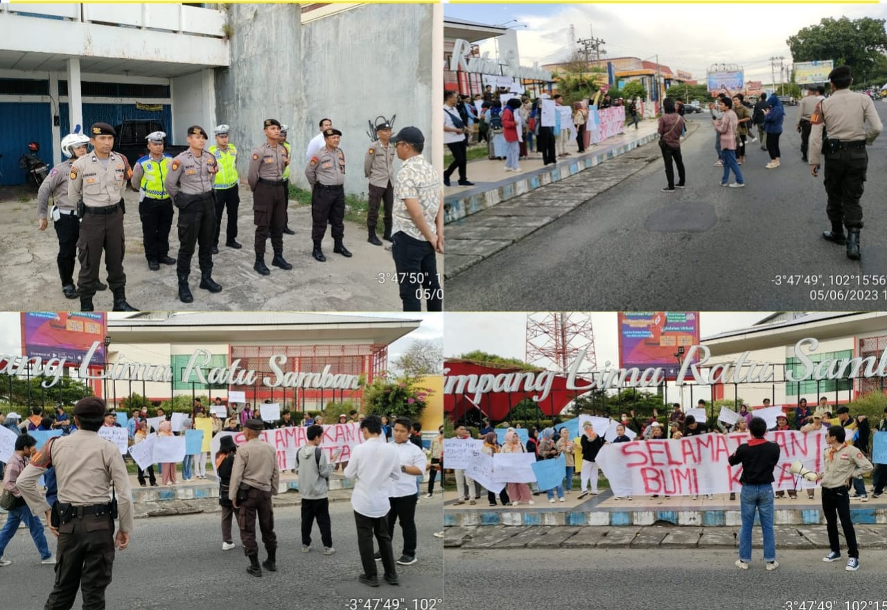 Bengkulu – Personel Polsek Ratu Samban dan Sat Samapta Polresta Bengkulu Polda Bengkulu, melaksanakan kegiatan pengamanan aksi unjuk rasa penggiat lingkungan, di Simpang Lima Ratu Samban Kota Bengkulu, Senin (5/6/2023).