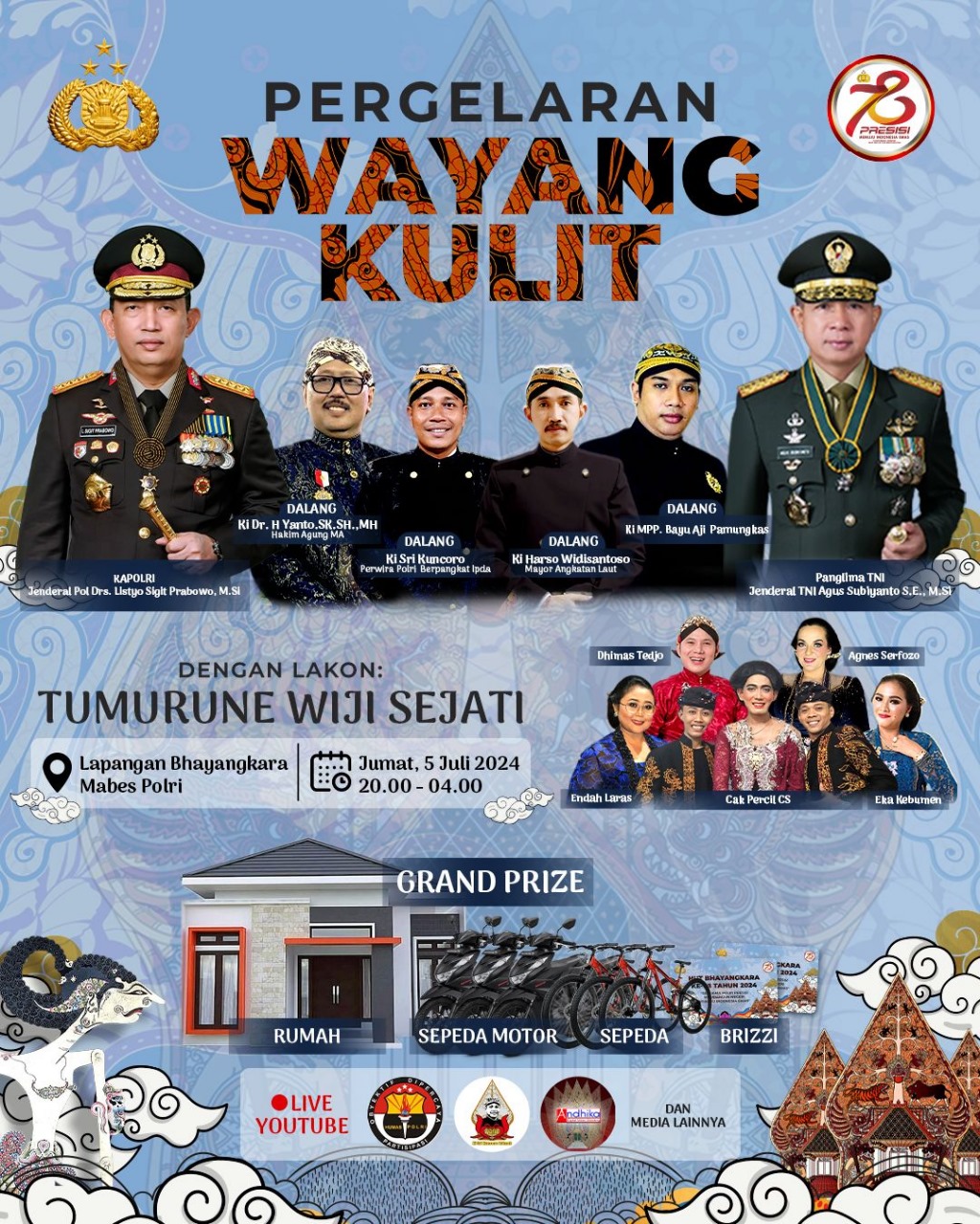 Ini merupakan tahun ketiga Polri mengadakan pertunjukan wayang kulit semalam suntuk dalam rangka Hari Bhayangkara. Seperti tahun-tahun sebelumnya, lakon dimainkan oleh 3 dalang, yakni Ki Yanto, yang merupakan Hakim Agung, Ki Sri Kuncoro, perwira Polri berpangkat Ipda, dan Ki Harso Widisantoso, anggota TNI berpangkat Mayor Angkatan Laut.
