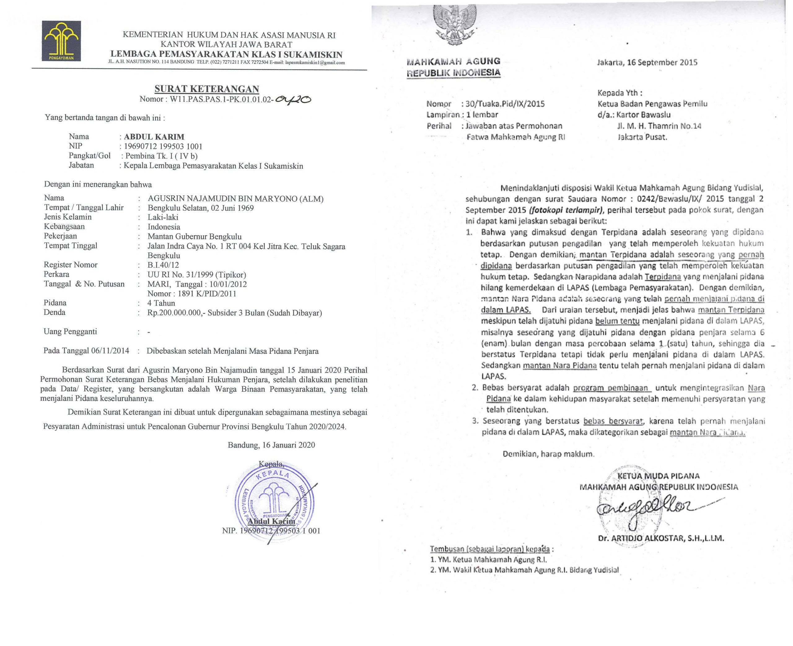 “Berdasarkan surat dari Agusrin Maryono Najamudin tanggal 15 Januari 2020 perihal permohonan Surat Keterangan Bebas Menjalani Hukuman Penjara, setelah dilakukan penelitian pada data/register yang bersangkutan adalah warga binaan Pemasyarakatan, yang telah menjalani pidana keseluruhan. Demikian Surat Keterangan ini dibuat untuk dipergunakan sebagaimana mestinya sebagai persyaratan administrasi untuk pencalonan Gubernur Bengkulu,” demikian kutipan dalam surat keterangan dari Lapas Klas I Sukamiskin bernomor W11.PAS.PAS.I-PK.01.01.02 ditandatangani Abdul Karim selaku Kepala Lapas Klas I Sukamiskin.