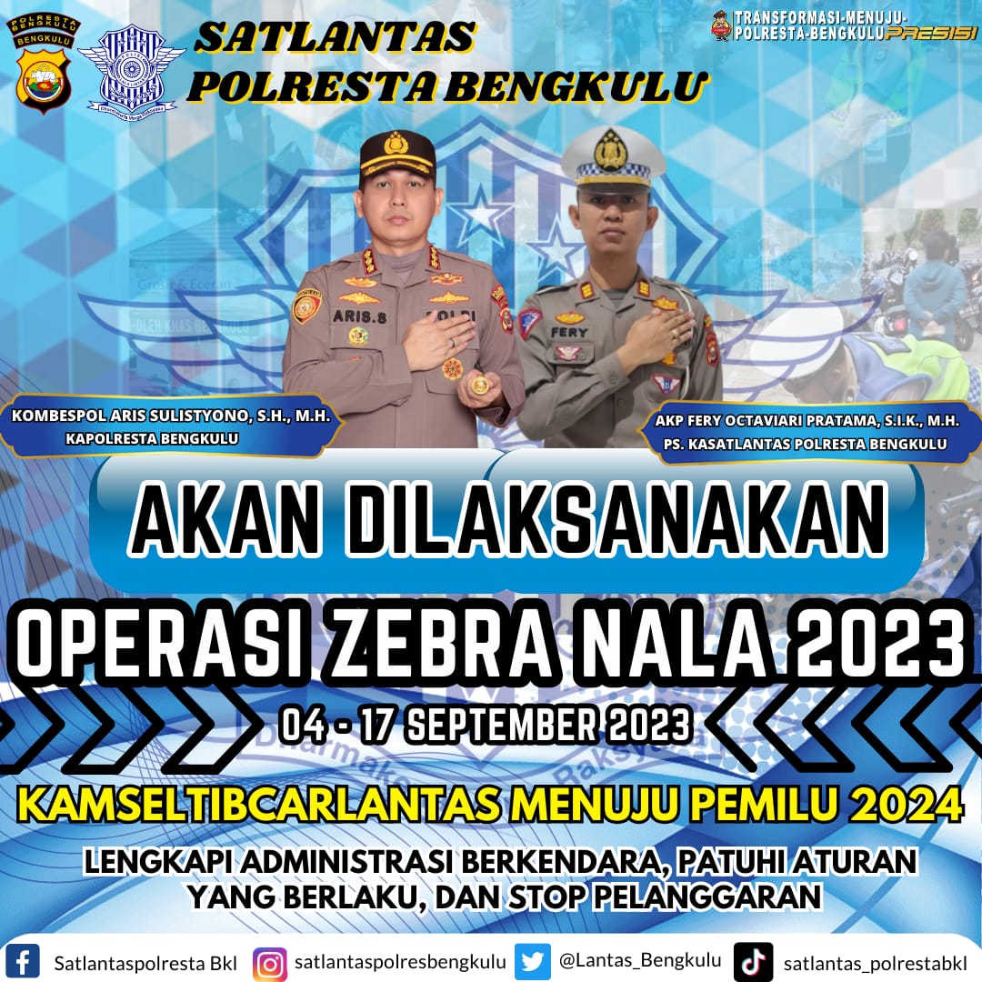 Bengkulu – Satlantas Polresta Bengkulu Polda Bengkulu menggelar Operasi Zebra Nala 2023. Operasi ini digelar mulai tanggal 4 sampai 17 September 2023.