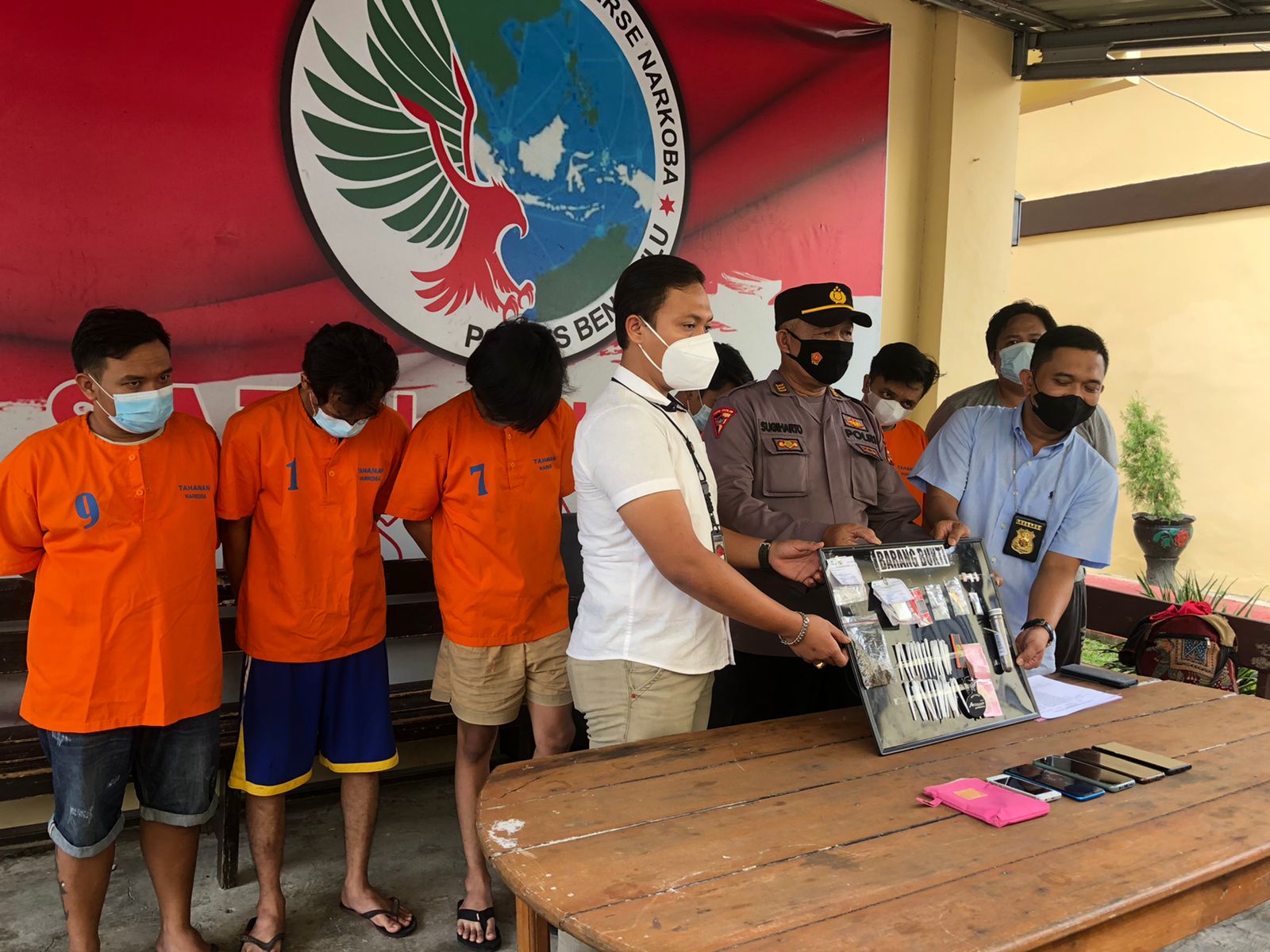Bengkulu, Siberindo.co – Polres Bengkulu kembali berhasil amankan pelaku penyalahgunaan Narkoba di Kota Bengkulu. Kasat Narkoba Polres Bengkulu Iptu Dony Juniansyah S.M bersama Kasihumas AKP Sugiharto serta KBO Sat Res Narkoba Ipda Albeth Salomo Sinulaki Sembiring S.IK menerangkan pihaknya berhasil mengamankan 6 orang laki-laki sebagai terduga pelaku dengan tempat dan waktu yang berbeda.