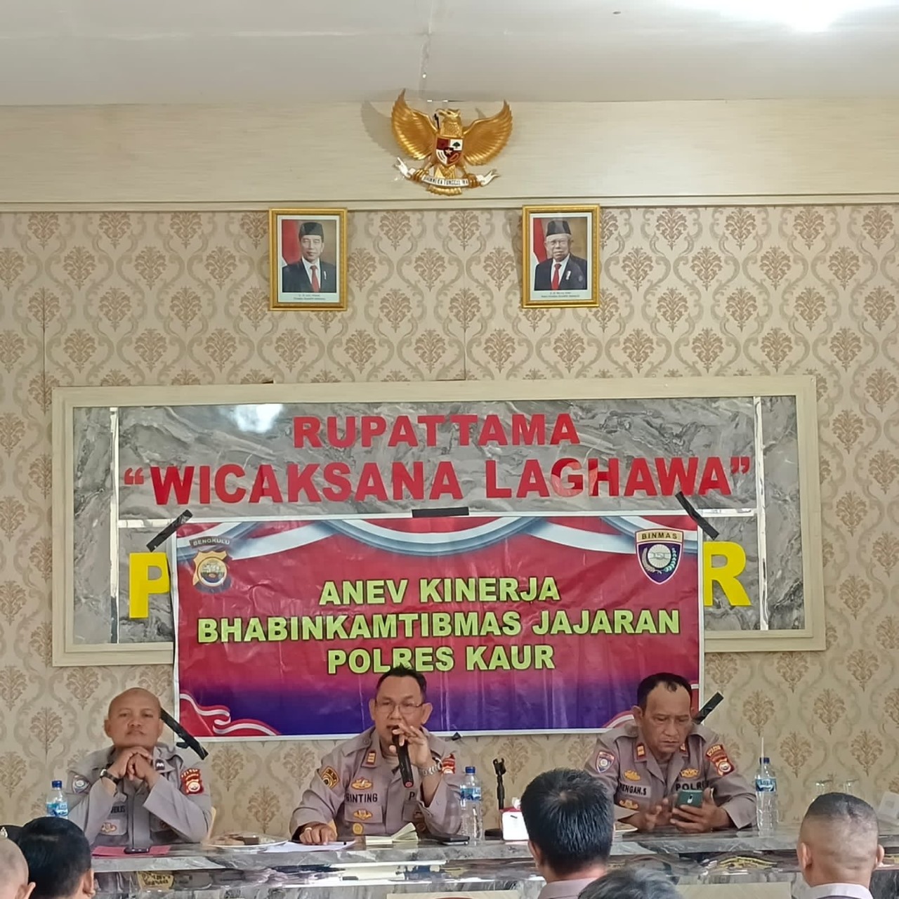 Anev Polres Kaur dan Polsek Jajaran dipimpin oleh Kabag SDM Polres Kaur AKP Rasih Ginting Samura, S.H., M.Si., dan diikuti oleh Para Kabag, Para Kasat, Para Kasi, Para Kapolsek jajaran dan Perwira Polres Kaur.