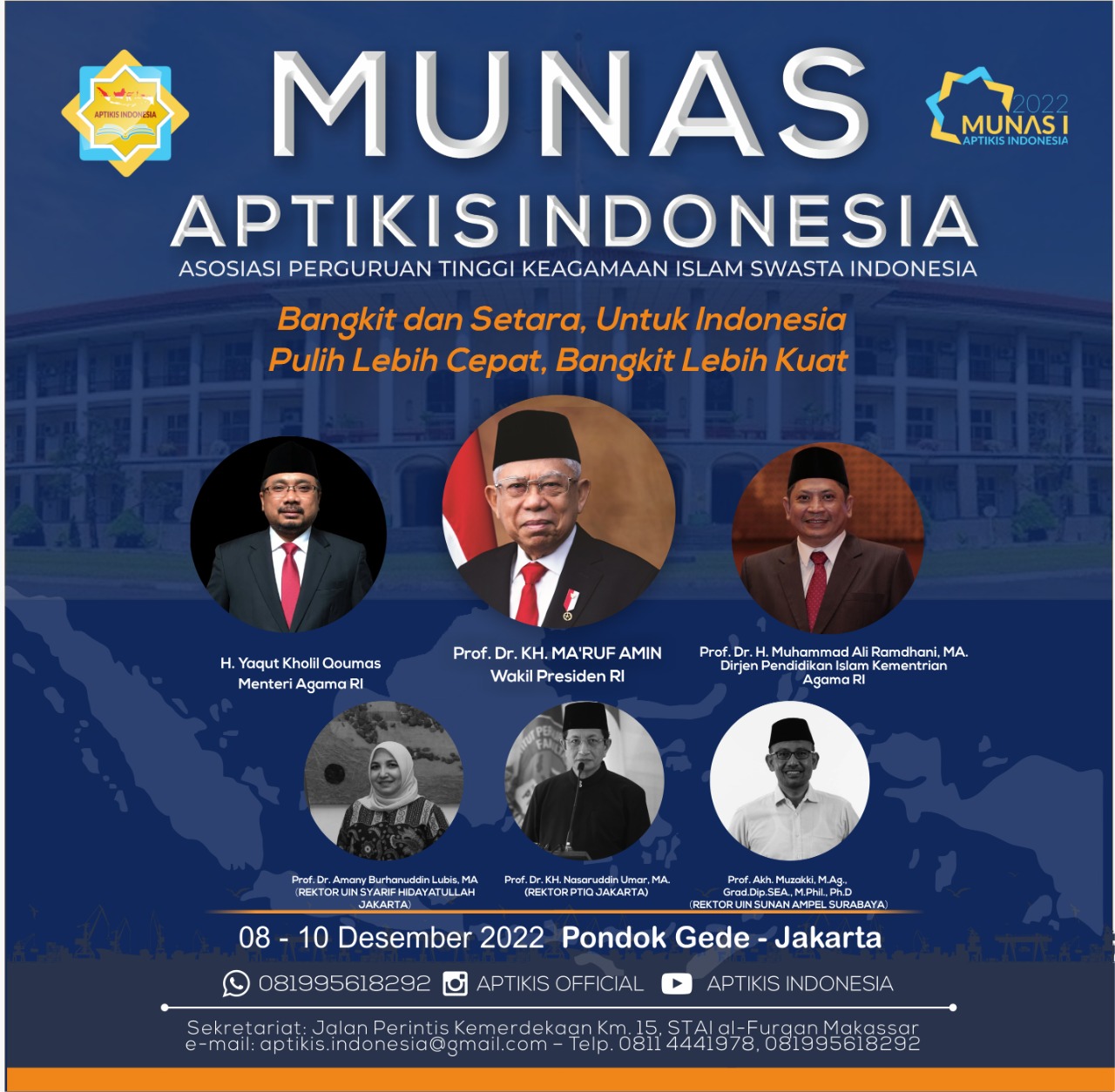 “Semangat itulah yang menjadi dasar kami untuk membentuk wadah bagi (PTIKIS), Musyawara Nasional (Munas) pertama akan digelar pada 08 s.d 10 Desember 2022 di Asrama Haji Pondok Gede untuk pengesahan Asosiasi Perguruan Tinggi Keagamaan Islam Swasta (APTIKIS) yang dibuka langsung oleh Wakil Presiden Republik Indonesia” jelas Ketua Umum. 06/12/2022.