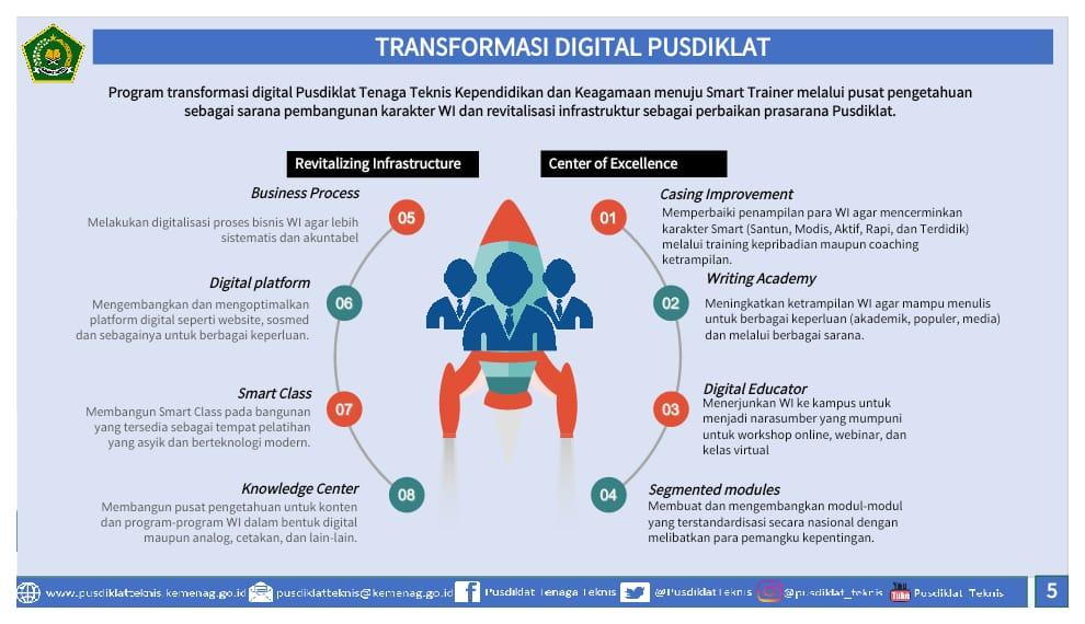 Hal tersebut langsung direspon oleh Pusdiklat Tenaga Teknis Kependidikan dan Keagamaan, Balitbang Diklat Kemenag. Kepala Pusdiklat Imam Safei mengatakan pihaknya sudah merumuskan delapan program transformasi digital.