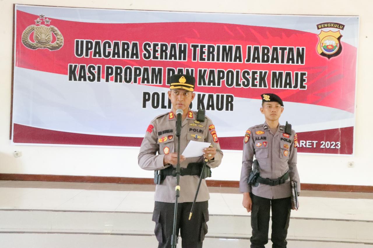 Dalam amanatnya, Kapolres mengucapkan terimakasih kepada personel yang hadir pada pelaksanaan serah terima jabatan Kasi Propam dan Kapolsek Maje Polres Kaur.