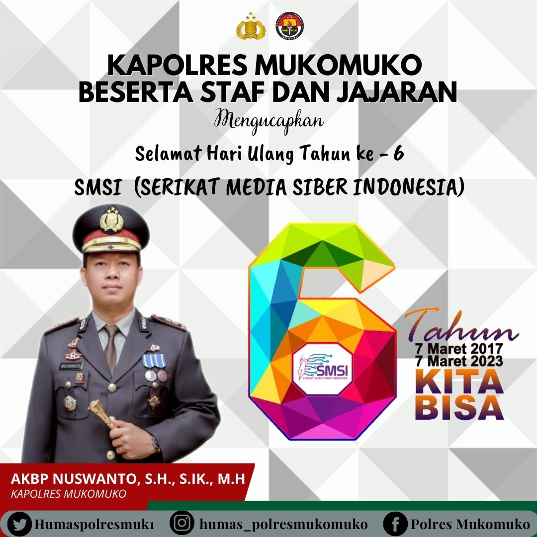 ”Saya selaku Kapolres Mukomuko beserta Staf dan Jajaran mengucapkan selamat ulang tahun SMSI ke 6 tahun yang jatuh pada tanggal 7 Maret 2023, semoga seluruh media yang tergabung dalam SMSI menjadi media yang semakin maju dalam memberikan informasi yang bermanfaat dan edukatif sehingga dapat membangun pola pikir yang positif bagi masyarakat,” ucap Kapolres Mukomuko.