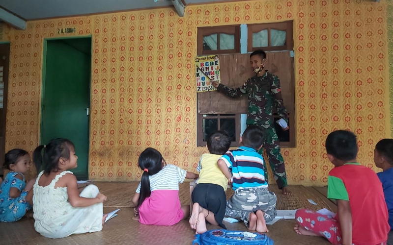 Personil Pos Klawik Satgas Pamtas RI-MLY Yonif 407/PK memberikan bimbingan belajar bagi anak-anak sekolah dasar (SD) di Dusun Keluin, Desa Mensiau, Kecamatan Batang Lupar, Kabupaten Kapuas Hulu, Kalbar. Kamis (06/05/2021).