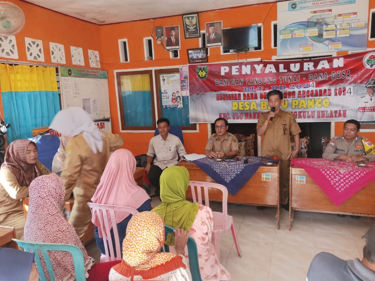 Bengkulu Selatan – Polsek Pino Polres Bengkulu Selatan Polda Bengkulu, Kapolsek Pino IPTU Andi diwakili Bhabinkamtibmas Bripka Dolly Fried Lubis S.H., menghadiri kegiatan Penyaluran BLT-DD bulan Mei TA. 2024 di Desa Batu Panco Kecamatan Ulu Manna Kabupaten Bengkulu Selatan, Senin (06/05/2024) Pagi.