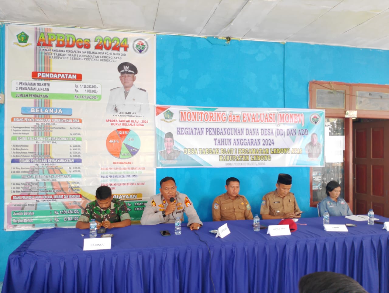 Lebong – Kapolsek Lebong Atas Polres Lebong Polda Bengkulu, Iptu Nur Huda, bersama Bhabinkamtibmas Briptu Waas, melaksanakan pendampingan Monev pelaksanaan APBDes DD dan ADD TA 2024, di Desa Daneu dan Desa Tabeak Blau I, Senin (6/5/2024).
