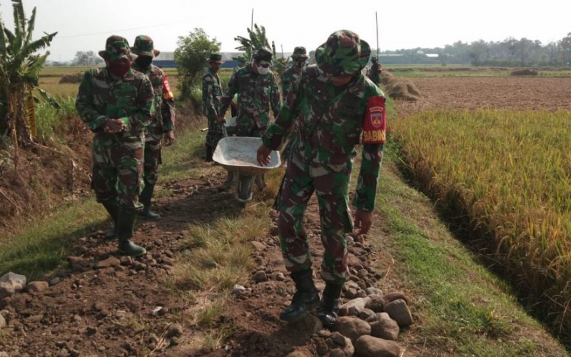 Anggota satgas TMMD Reguler ke-111 tahun 2021 Kodim 0718/Pati di Desa Tamansari Kecamatan Jaken Kabupaten Pati.