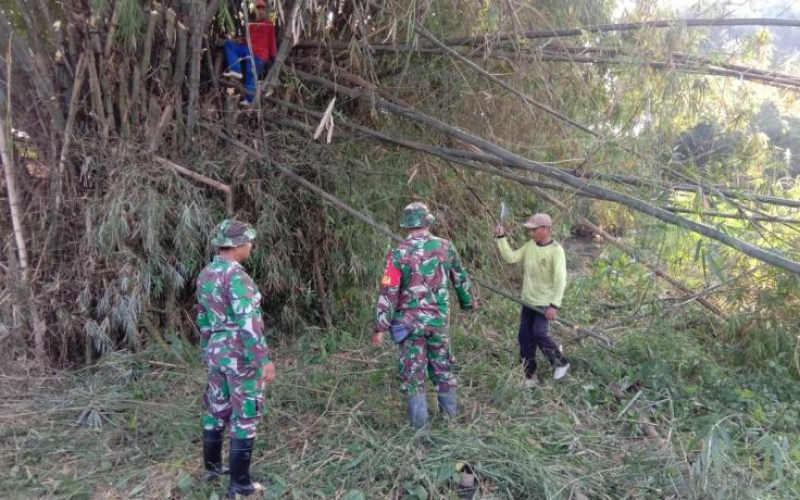 Terlihat bersama masyarakat yang ada di Dukuh Kemiri Desa Tamansari, Kecamatan Jaken, Kabupaten Pati yang dengan penuh semangat bersama dengan beberapa personel TNI memotong pohon bambu yang akan digunakan sebagai sarana pendukung pembangunan rumah warga, Minggu (06/6/2021).