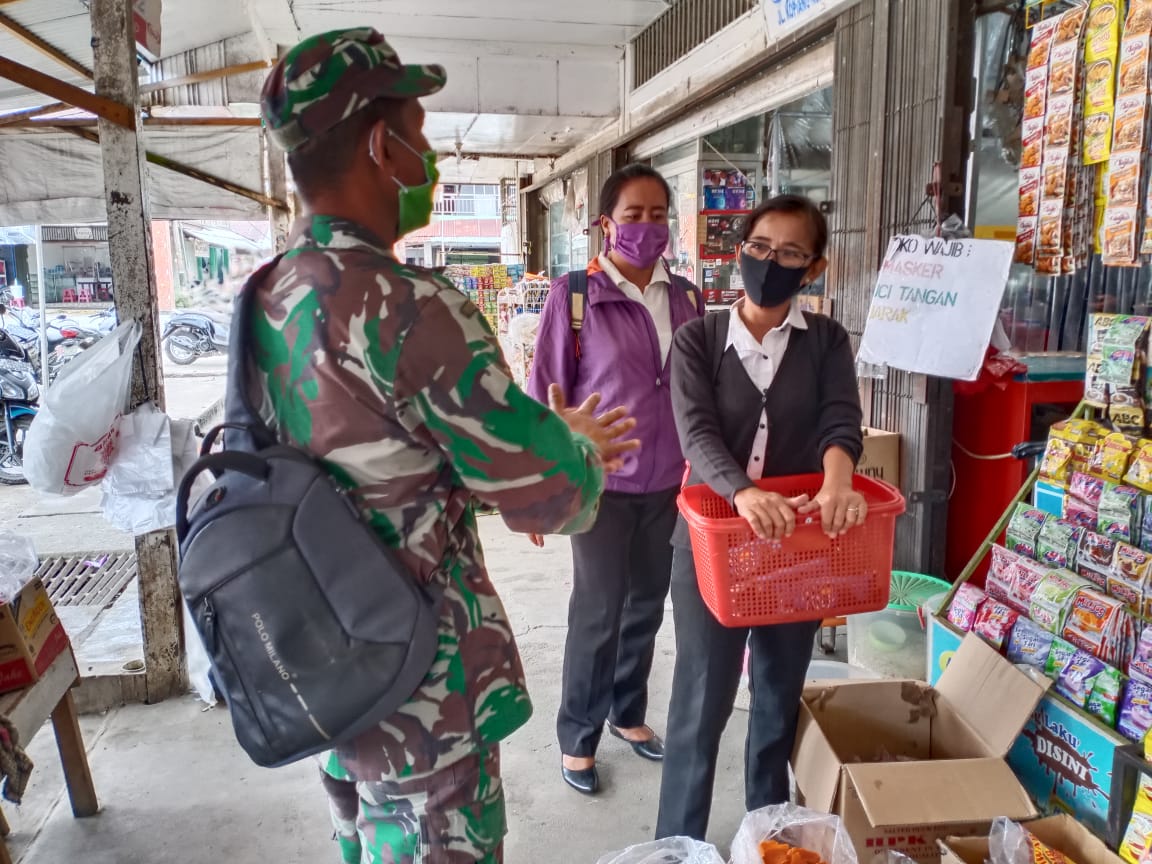 Landak – Personil Koramil 08/Mandor, Kodim 1201/Mph melaksanakan penegakan disiplin protokol kesehatan (Prokes) pencegahan Covid-19 di Pasar Mandor, Kabupaten Landak, Minggu (6/6/2021).
