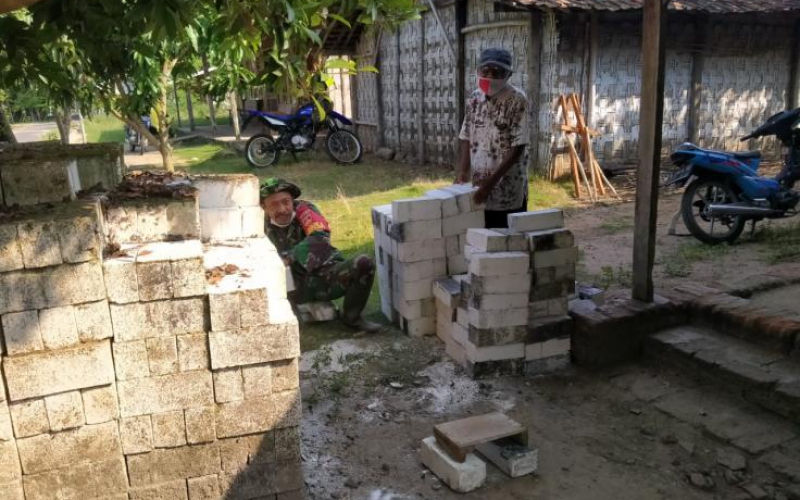 Tidak pedulikan  kotoran dan debu, Sersan Dua Subakir anggota Kodim 0718/Pati nampak sedang membersihkan bata hebel untuk program Rumah Tidak Layak Huni (RTLH), ini dimaksutkan agar pemasangan bata hebelnya nanti tidak mengalami kendala, juga awet kedepannya.