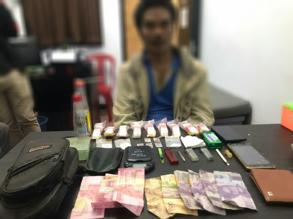 Setelah berhasil ditangkap kemudian dilakukan penggeledahan ditemukan barang bukti berupa 1 paket sedang sabu, 5 paket kecil sabu, 1 buah timbangan digital, 9 bal plasrik klip bening, 3 buah korek api gas, 1 buah kaca pirex, handphone, alat hisap sabu (bong), serta uang tunai Rp350 ribu.