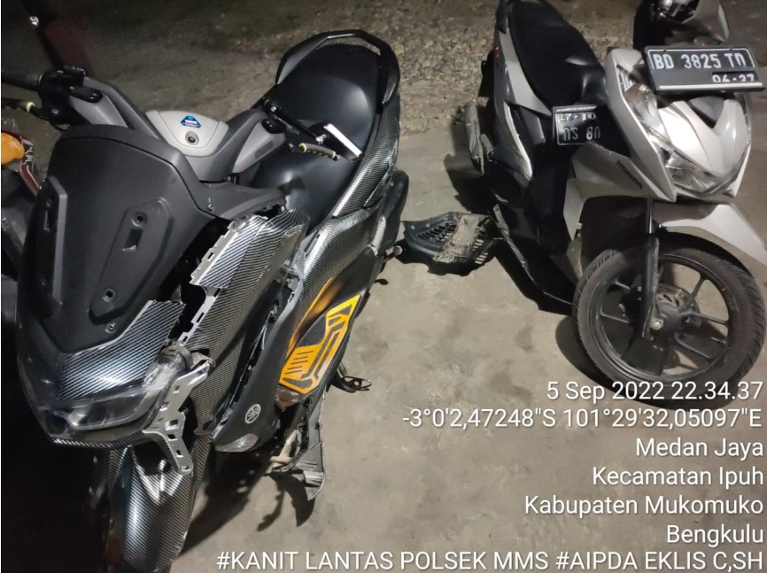 Keduanya terlibat dalam laka lantas saat masing-masing mengendarai sepeda motor terang Kapolres Mukomuko Polda Bengkulu AKBP Nuswanto SH S.IK MH melalui Kapolsek Mukomuko Selatan didampingi Kanit Lantas Aipda Eklis C, SH, dalam keterangan tertulisnya.