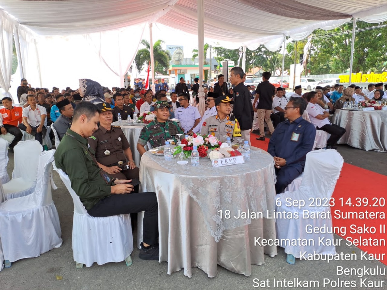 Kaur – Kapolres Kaur Polda Bengkulu AKBP Eko Budima, menghadiri kegiatan serah terima Kirab Pemilu Tahun 2024 dari KPU Bengkulu Selatan Ke KPU Kaur dengan tema Pemilu Sebagai Sarana Integrasi Bangsa, bertempat di Halaman Gedung Sentral Kuliner Kab. Kaur, Rabu (06/09/2023).