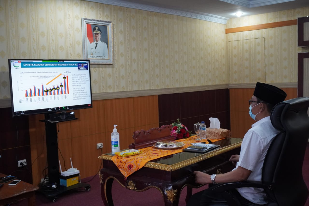 Bengkulu, Siberindo.co – Plt Asisten I Setda Provinsi Bengkulu Supran, hadiri Rapat Koordinasi Nasional Antisipasi Bencana Hidrometeorologi, Gempa Bumi dan Tsunami secara virtual di Ruang Pola Pemda Provinsi Bengkulu, Rabu (07/10/2020).