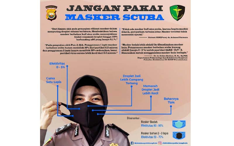 Menyikapi hal tersebut, Kabid Dokkes Polda Bengkulu Kombes Pol dr. I G.A.A. Diah Yamini D, Sp. THT-KL tidak menyarankan penggunaan masker scuba. Ia mengatakan masker scuba dan buff kurang efektif dalam menangkal Virus Corona.