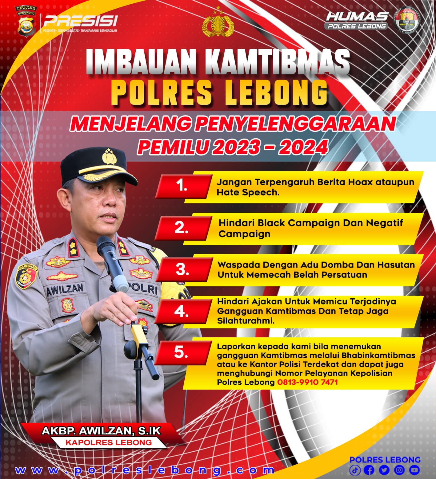 Kapolres Lebong Polda Bengkulu AKBP Awilzan, S.I.K., melalui PS Kasubsi PIDM Humas Aipda Syaiful Anwar menyampaikan, imbauan Kapolres Lebong tersebut dapat disebarluaskan oleh siapapun dalam rangka mendukung terciptanya Kamtibmas yang kondusif menjelang Pemilu 2024.