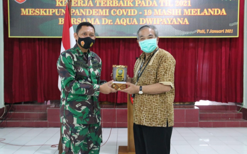 Disambut oleh Komandan Kodim 0718/Pati Letkol Czi Adi Ilham Zamani, SE, M.I.Pol bersama Kasdim Pati Mayor Inf Much. Sholihin, S.Ag, M.Si, kedatangan motivator nasional Dr. Aqua Dwipayana didampingi Pasi Wanwil Korem 073/Mkt Mayor Kav Budi Saroyo. Kamis, (07/01/2021).