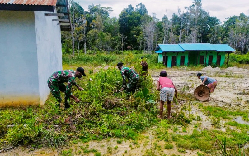 Prajurit TNI dari Yonif 407/PK yang tergabung dalam Satuan Tugas Pengamanan Perbatasan (Satgas Pamtas) antara RI – Malaysia, menggelar Karya Bhakti di halaman Kantor Balai Desa Sei Kelik, Kecamatan Ketungau Hulu, Kabupaten Sintang, Kalbar. Sabtu (06/02/2021)